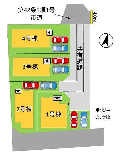 | 駐車場 | 2台 | 道路の幅員 | 4号棟:北4m /1号棟:北4m 南5m /2号棟:北4m 南5m |