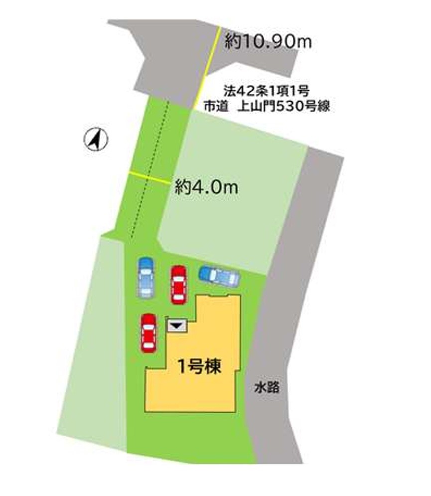 | 駐車場 | 4台 | 道路の幅員 | 1号棟:北10.9m |