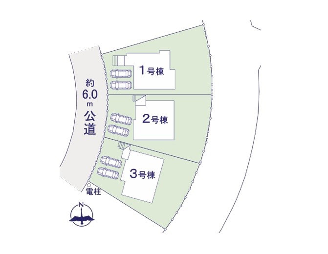 | 駐車場 | 2台 | 道路の幅員 | 1号棟:西6m /2号棟:西6m /3号棟:西6m |