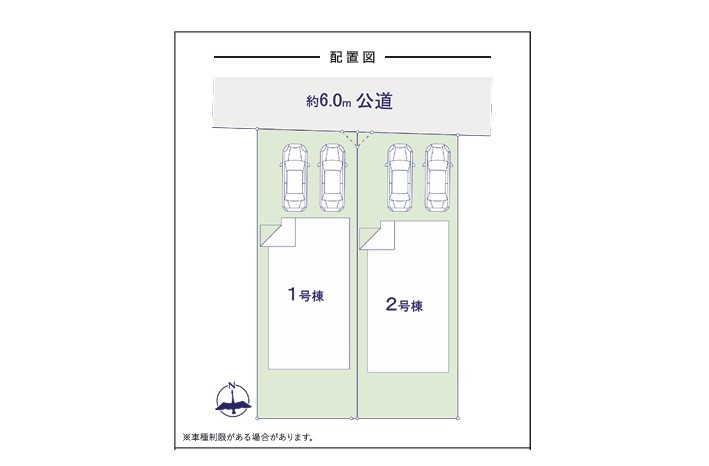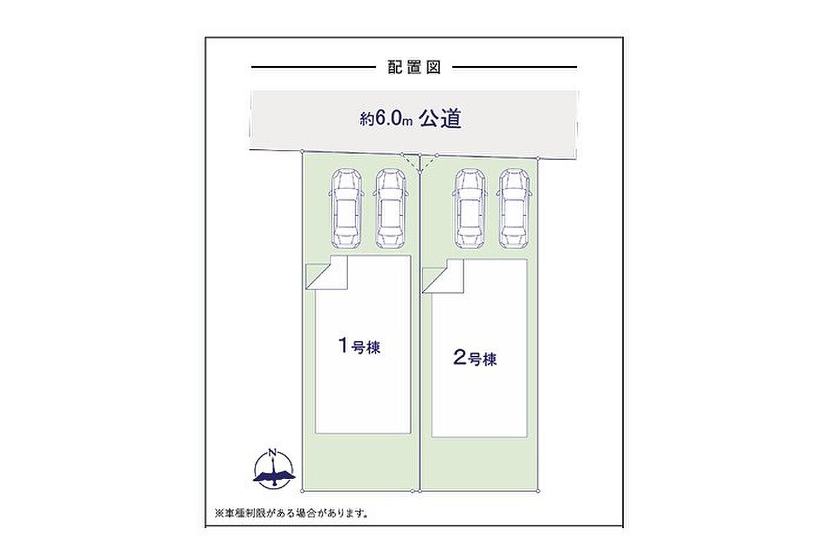| 駐車場 | 2台 | 道路の幅員 | 1号棟:北6m /2号棟:北6m |