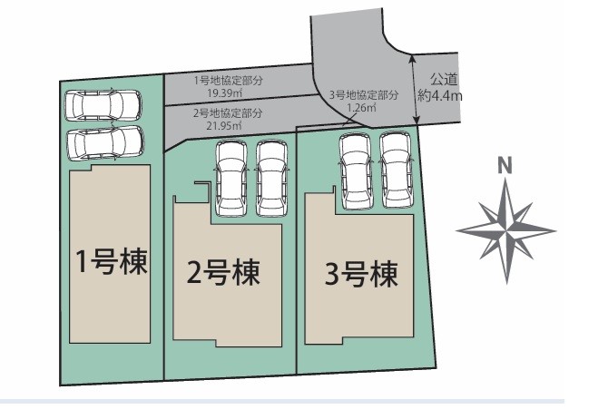 | 駐車場 | 2台 | 道路の幅員 | 2号棟:北東4m /1号棟:北東4m /3号棟:北東4m |