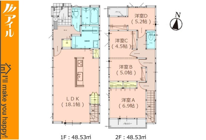2号棟 間取り 4LDK 価格 4998万円 建物面積 97.5m2 土地面積 165.49m2 -