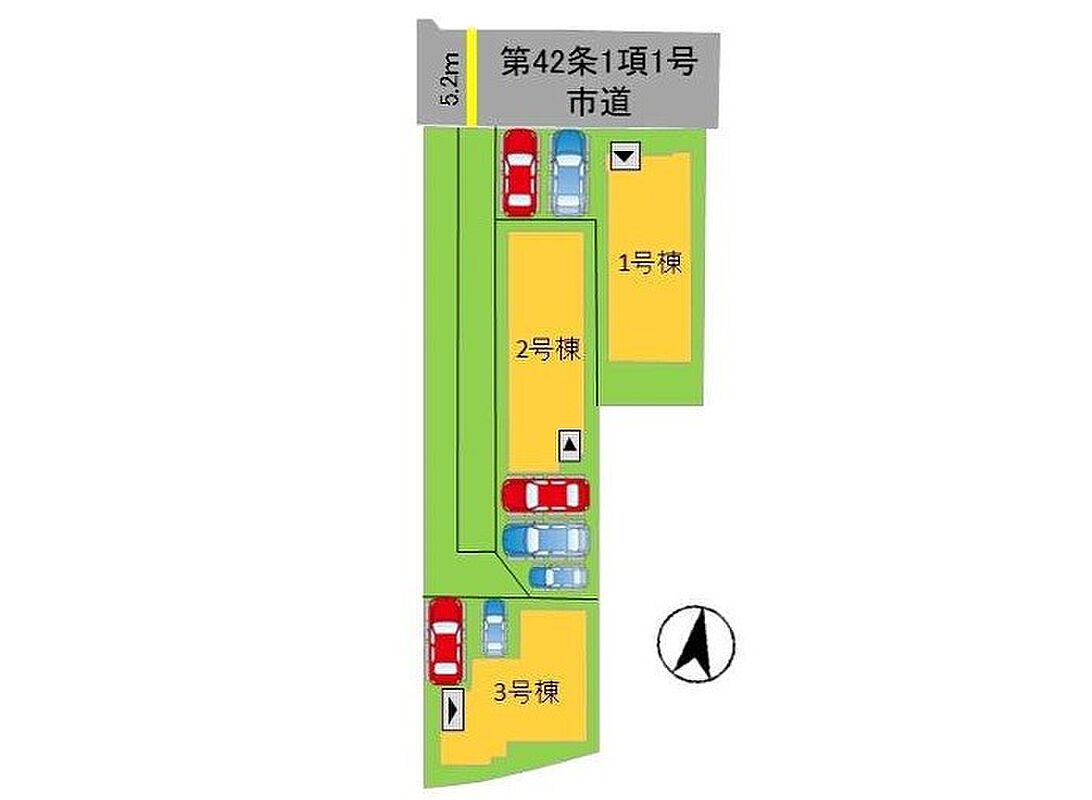 | 駐車場 | 2台 ~ 3台 | 道路の幅員 | 1号棟:北5.2m /3号棟:北5.2m /2号棟:北5.2m |