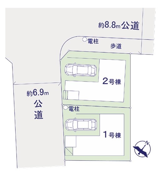 | 駐車場 | 1台 | 道路の幅員 | 1号棟:南西6.9m /3号棟:南西6.9m 北西8.8m |