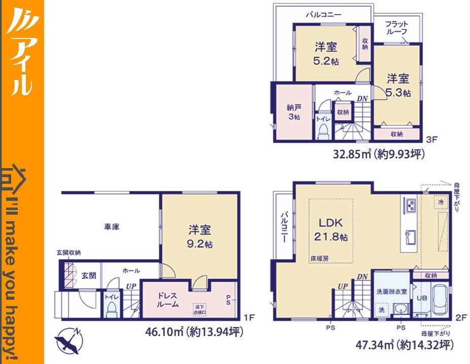■アイルは安心の創業39年! 定休日なし 毎日現地見学可能 店舗はリクルート天神ビル4Fです ■現地案内随時受付中 当日のご内覧も可能です!お仕事帰りのお時間でも事前にご相談頂ければ調整いたします。 ・さくっとコース・・・忙しいお客さまでもさくっとご見学可能です。 ・ゆっくりコース・・・細かい設備等もゆっくりとご説明させていただきます。 ・じっくりコース・・・分譲地+周辺環境なども一緒にご紹介可能です。 その他お客さまのご予定に合わせてご内覧いただけます。 ■お子様連れでのご内覧・ご来店も大歓迎! お子様向けのお菓子等ご用意しております。お気軽にお申し付けくださいませ。 ■ご案内方法 ◎お客さまのご指定時間帯に、現地物件でのお待ち合わせ ◎担当スタッフによる送迎 ・ご自宅 ・最寄駅 ・物件近くの目印施設 etc… その他ご希望のお迎え場所等ございましたらお気軽にご相談下さい。 ◎弊社にご来店される場合 福岡市中央区舞鶴1-1-3 リクルート天神ビル4F ※お車でお越しの場合、駐車場料金は弊社が負担いたしますのでご安心ください 『接道』一方 南西6.9m公道 『法令上の制限』宅地造成工事規制区域:有高度地区:有 設備:個別LPG 公営水道 下水 防犯シャッター 駐車場1台 閑静な住宅地 地盤調査済 前道6m以上 周辺交通量少なめ スーパーが近い(10分以内) 小学校徒歩10分以内 保育施設・幼稚園5分以内 公園5分以内 コンビニ5分以内 システムキッチン ガス3口 カウンタキッチン 対面キッチン 食器洗い機付き 浄水器 追い焚き 浴室乾燥機 オートバス付き トイレ2ヶ所 浴室に窓 浴室暖房 バルコニー 3階建以上 LDK20畳以上 採光2面 採光3面 東南向き 全室フローリング リビング階段 クローゼット ウォークインクローゼット 収納 床下収納 下駄箱 納戸 シューズインクローク シャンプドレッサー付き フラット35Sに対応 年内入居可 モニタ付きインターフォン 複層ガラス 火災警報器(報知機) 陽当り良好 暖房あり 24時間換気システム |