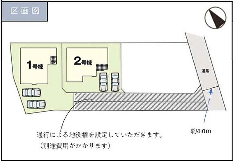 | 駐車場 | 2台 | 道路の幅員 | 1号棟:北東4m /2号棟:北東4m |