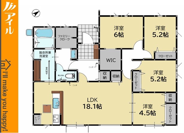 ◆LDK18.1帖、WIC・ファミリークローク付 ◆脱衣所兼洗濯室には便利なカウンター&室内物干しを設置 ◆階段のない平屋で家族みんなが同じフロアで過ごし、広い敷地に子ども達の笑い声が響く毎日を