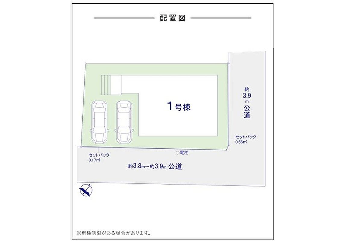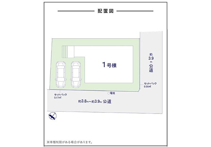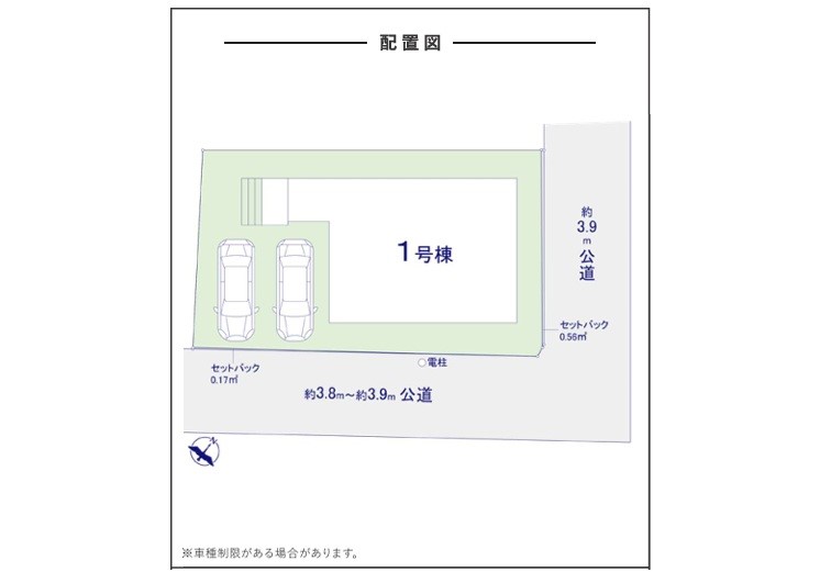 | 駐車場 | 2台 | 道路の幅員 | 1号棟:南東3.8m 北東3.9m |