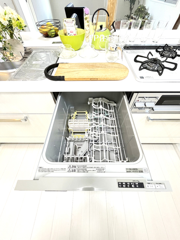 手間をかけずに食後の後片付けができる食器洗浄乾燥機。食器の出し入れがスムーズなスライドタイプ。高温で洗うのでしつこい油よごれもすっきり落ち、除菌もできます。また手洗よりも節水でき、節約にもなります。