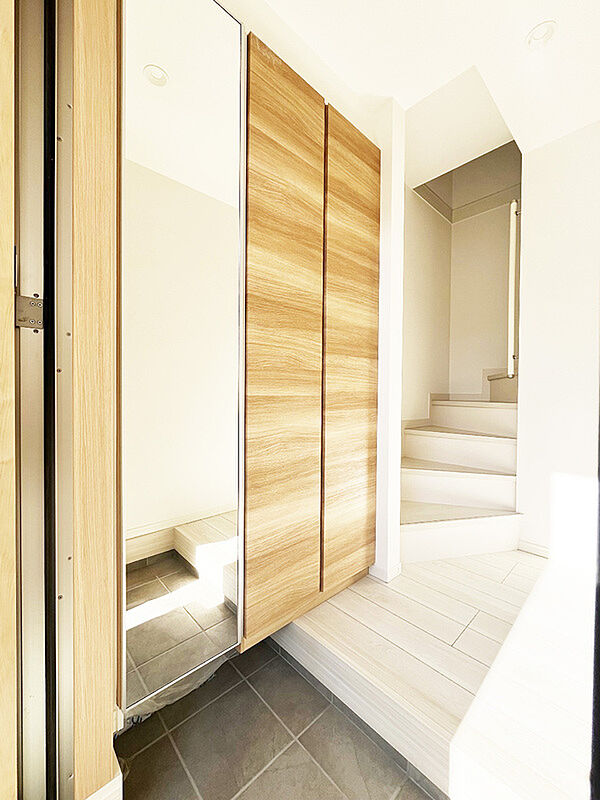 玄関収納は、天井まであるタイプのため、家族全員の履物がたっぷり...