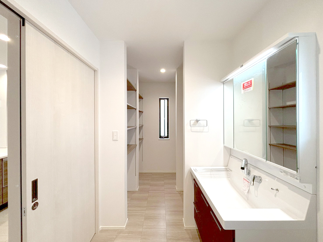 ・ゆとりある21帖のLDK、大型パントリー付き(C号棟) ランドリールームが一体となった広々洗面スペース(A・B号棟)