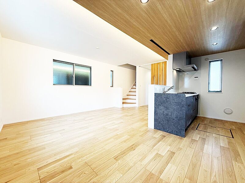 3面採光の明るいLDK 木目調天井のお洒落なキッチン廻り 食器洗浄乾燥機付き、人造大理石天板仕様