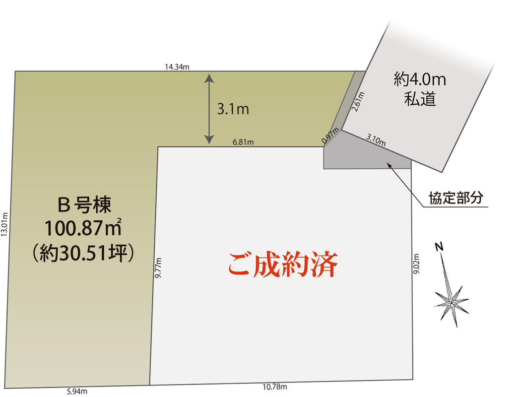 | 駐車場 | 1台(ハイルーフ駐車場1台分) | 道路の幅員 | 南東側約4.0m私道(私道持分あり70m2×各100/900) |
