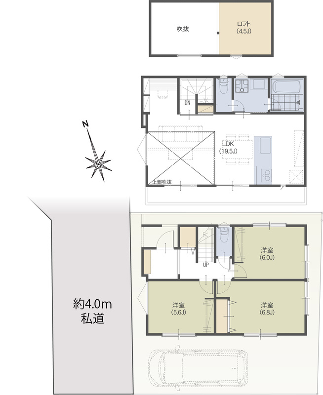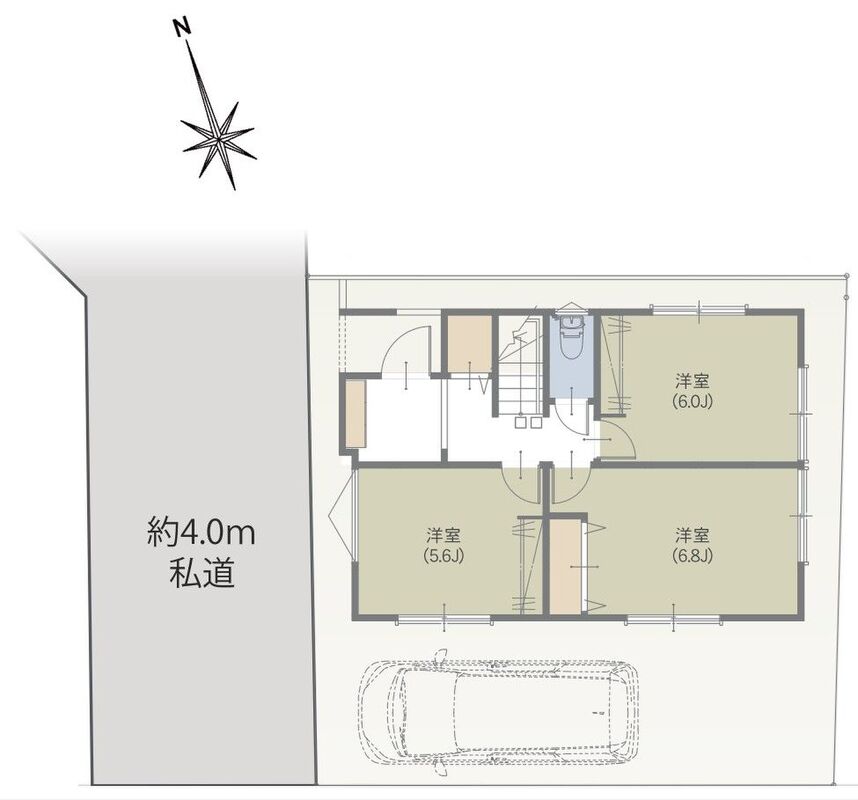 | 駐車場 | 1台(ハイルーフ駐車場1台分) | 道路の幅員 | 西側約4.0m私道 |