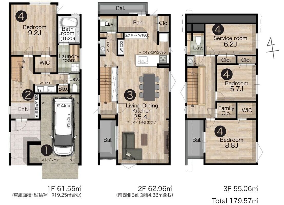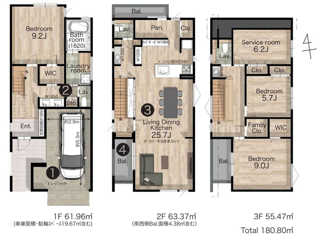 - A号棟179.57m2(車庫など23.63m2含む)・B号棟180.80m2(車庫など24.05m2含む)