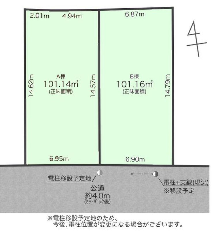 | 建物面積 | A号棟179.57m2(車庫など23.63m2含む)・B号棟180.80m2(車庫など24.05m2含む) | 土地面積 | A号棟101.14m2、B号棟101.16m2 |