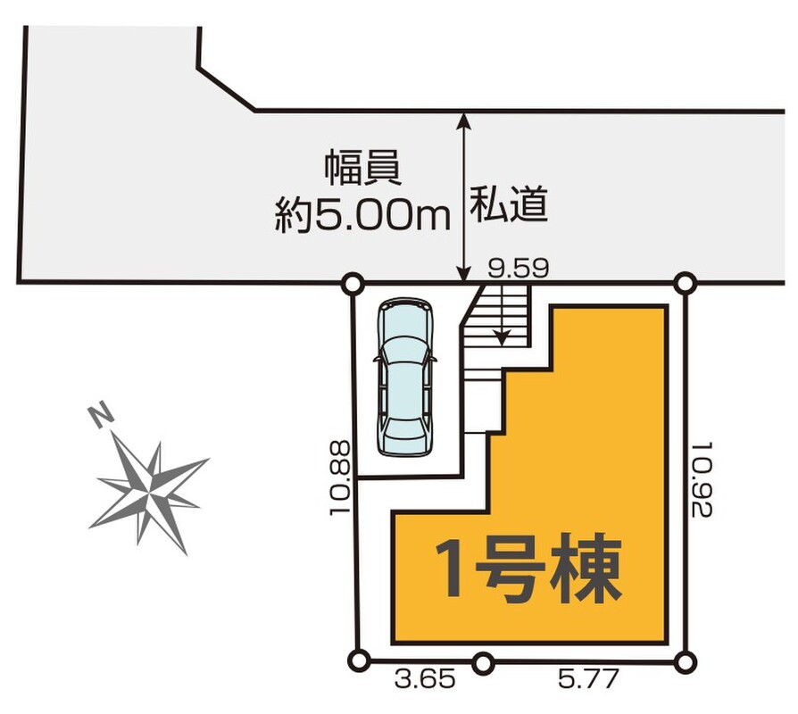 | 駐車場 | 1台(ハイルーフ駐車場1台分) | 道路の幅員 | 北東側約5.0m私道 |
