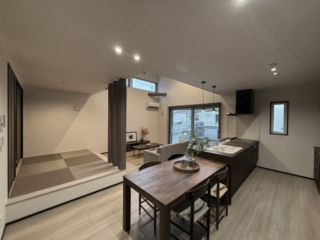 魅力1 キッチンからリビング・ダイニング・畳コーナーまで一望できる、奥行きのある間取り