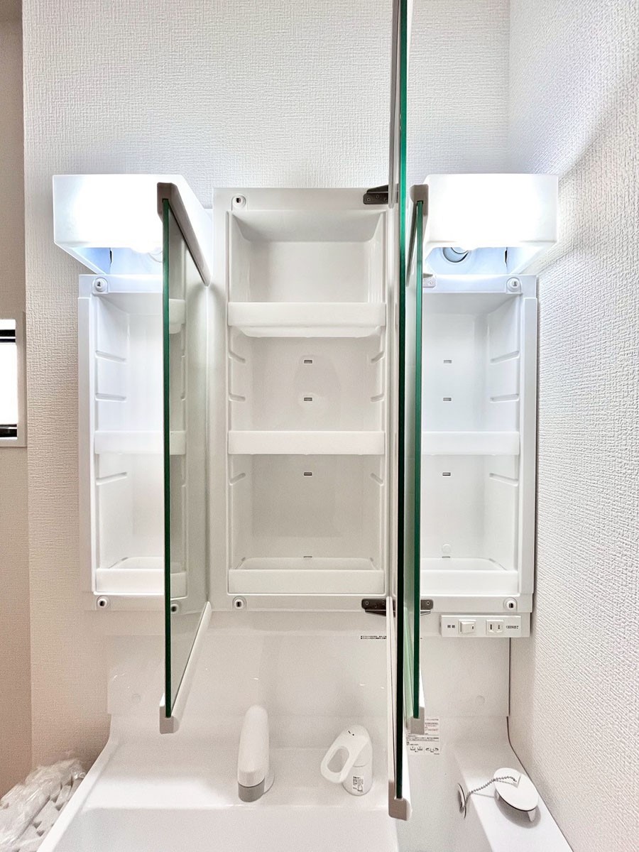 三面鏡の裏に、化粧品や衛生用品などを収納...