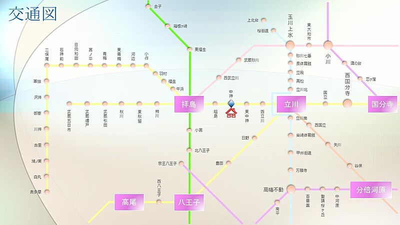 JR青梅線「中神」駅 徒歩4分 JR青梅線「東中神」駅 徒歩14分 JR青梅線「昭島」駅 徒歩22分 |