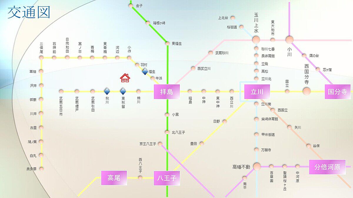 JR青梅線「福生」駅 バス10分「下草花」 徒歩3分 JR五日市線「秋川」駅 バス10分「下草花」 徒歩3分 JR五日市線「東秋留」駅 徒歩20分 |