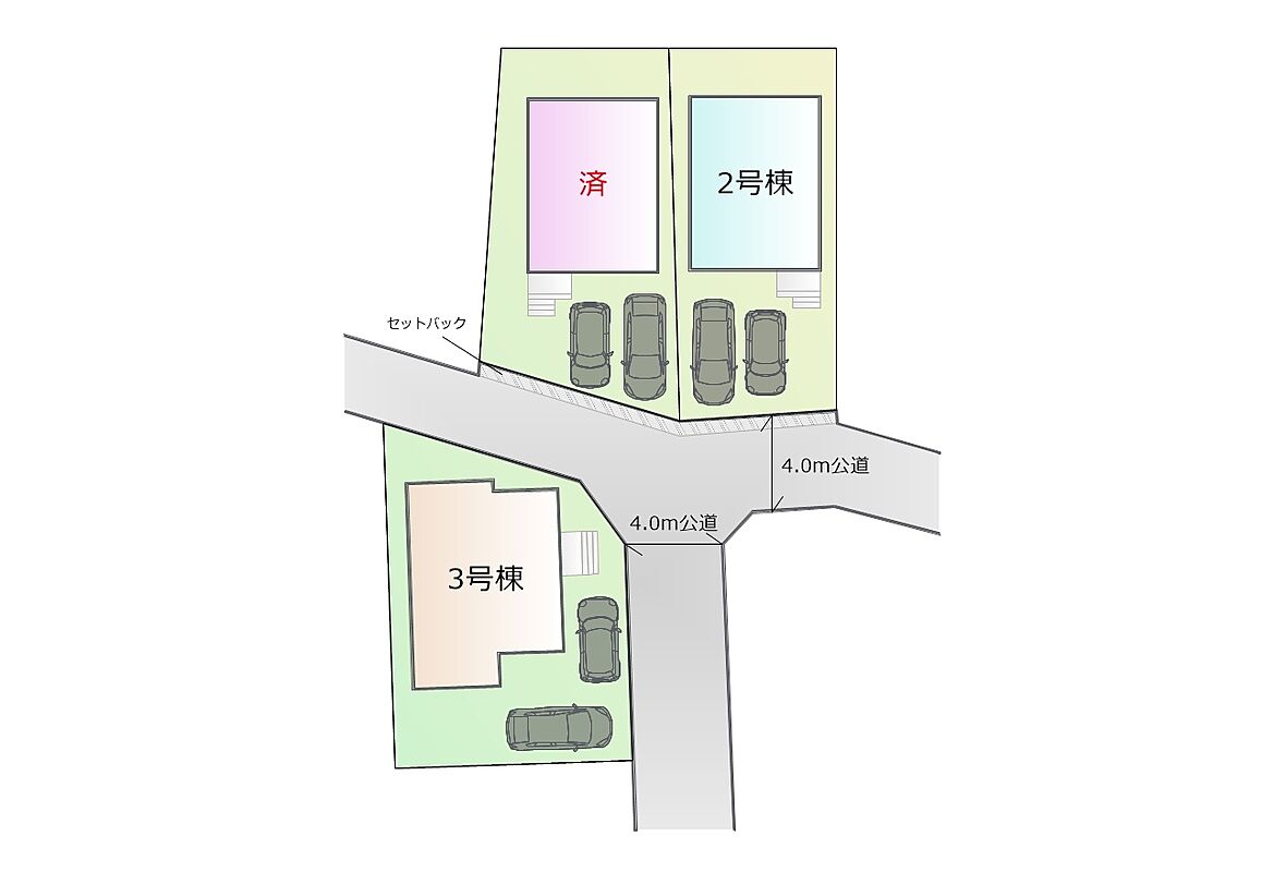| 駐車場 | 2台 | 道路の幅員 | 北側4.0m公道、南側4.0m公道、東側4.0m公道 |