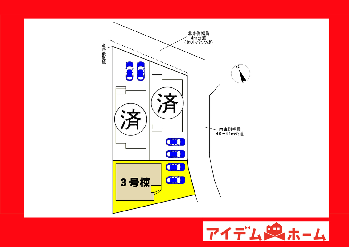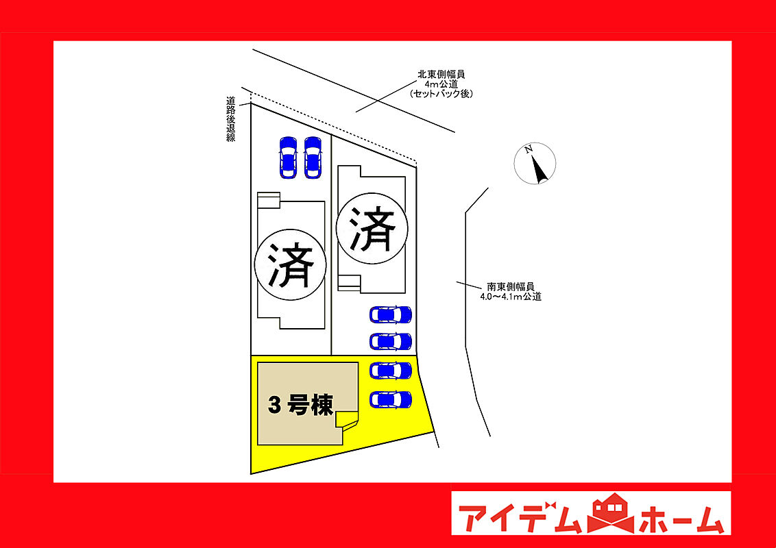 | 駐車場 | 1台 ~ 2台 | 道路の幅員 | 北東側4.0m公道(セットバック後)、南東側4.0~4.1m公道 |