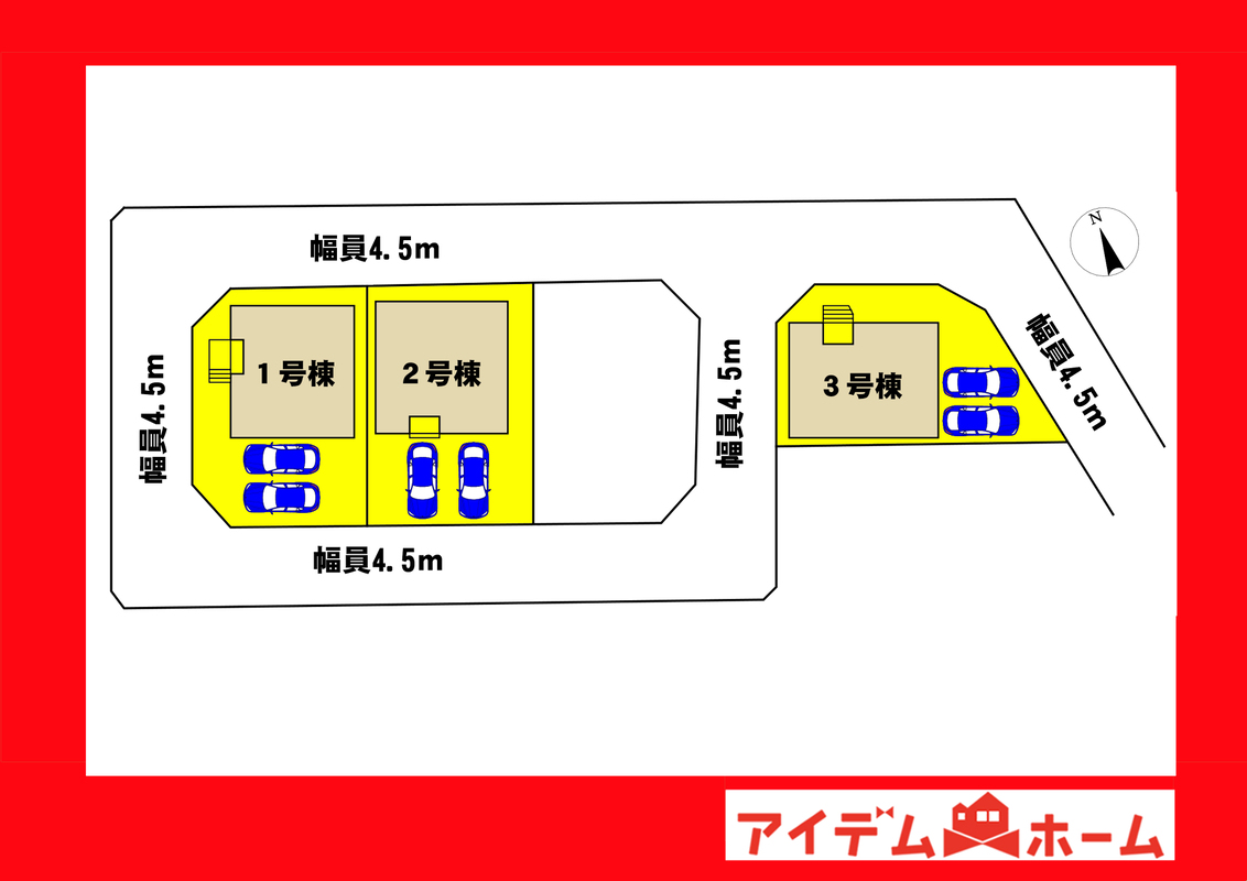 | 駐車場 | 1台 ~ 2台 | 道路の幅員 | 北側幅員4.5m公道、南側幅員4.5m公道、西側幅員4.5m公道、東側幅員4.5m公道 |