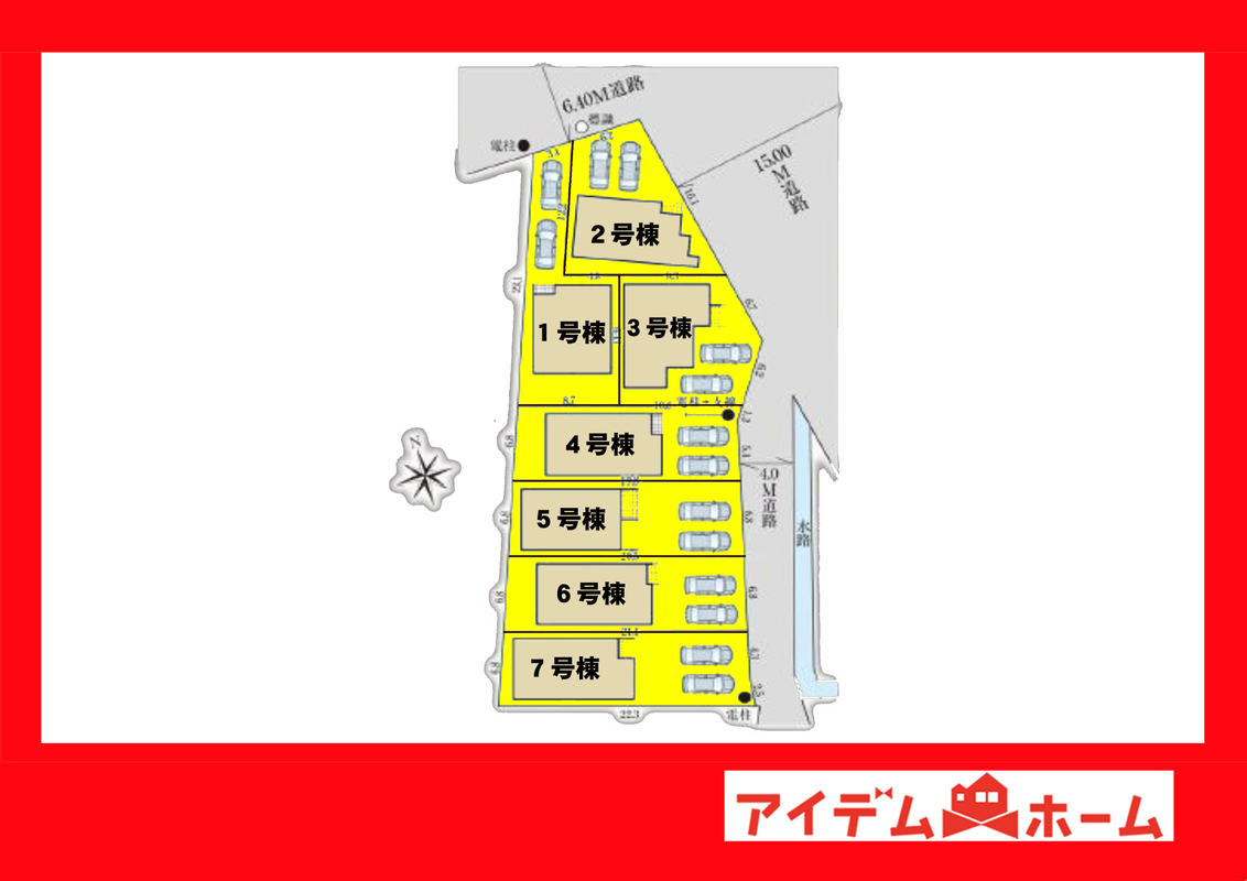 | 駐車場 | 1台 ~ 2台 | 道路の幅員 | 北側幅員約6.4m公道、北東側幅員15.0m公道、南東側幅員約4.0m公道 |