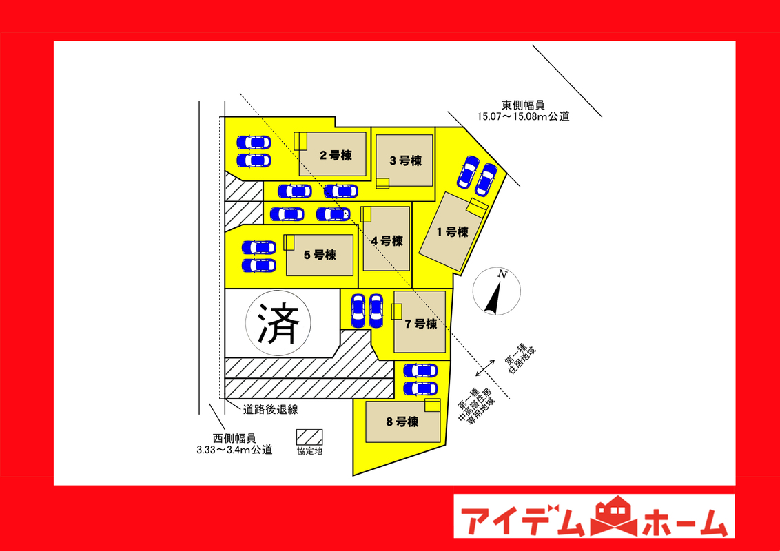 | 駐車場 | 1台 ~ 2台 | 道路の幅員 | 西側幅員3.3m公道、北側幅員15m公道 |