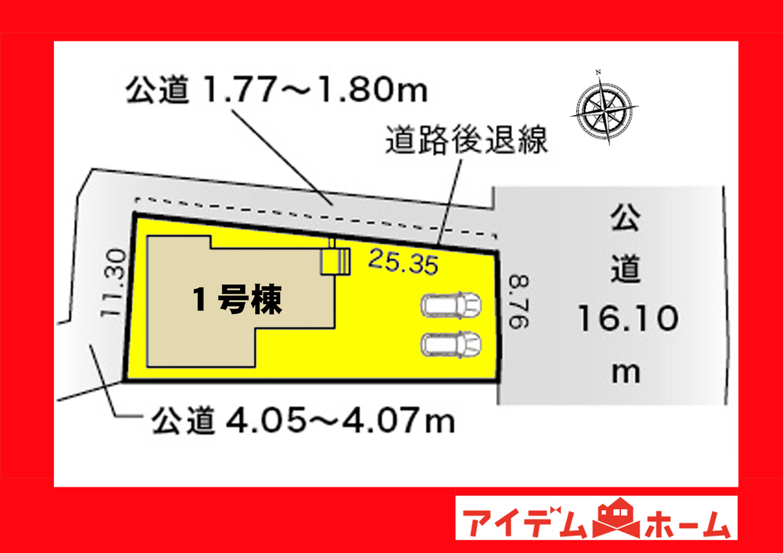 | 駐車場 | 1台 ~ 2台 | 道路の幅員 | 東側幅員16.10m公道、北側幅員1.7m公道、西側幅員4m公道 |