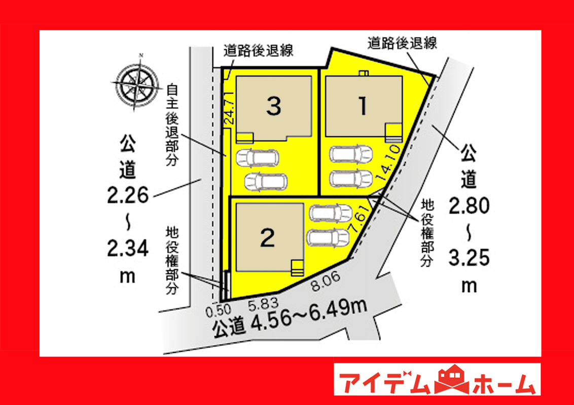 | 駐車場 | 1台 ~ 2台 | 道路の幅員 | 西側幅員2.2m公道、南側幅員4.5m公道、東側幅員2.8m公道 |