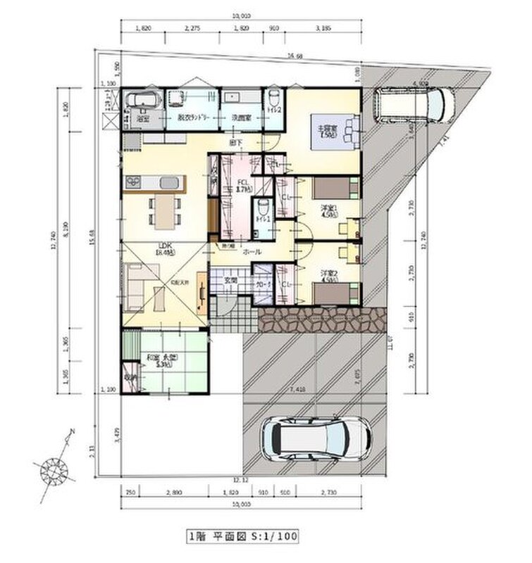 | 駐車場 | 2台(車種による) | 道路の幅員 | 私道負担:無、東6m幅 |