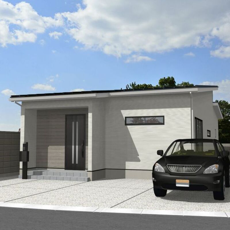 ■内観・外観のおすすめポイント・LDK18帖で家族が自然と集まりやすい平屋プラン・ホワイト基調のシンプル外観と約3台分の駐車スペース確保・高天井リビングで開放感ある明るい室内空間