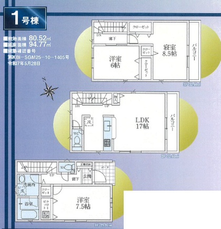 1号棟 間取り 3LDK 価格 2390万円 建物面積 94.77m2 土地面積 80.52m2 -
