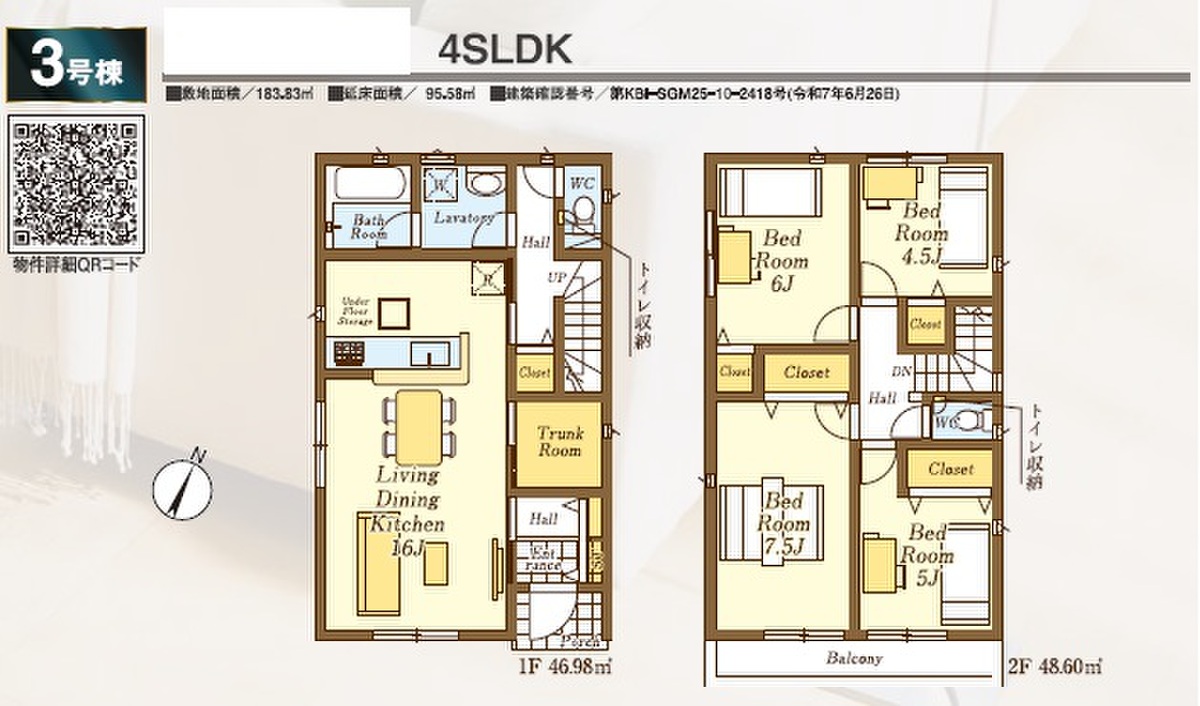 3号棟 間取り 4SLDK 価格 1990万円 建物面積 95.58m2 土地面積 183.83m2 -