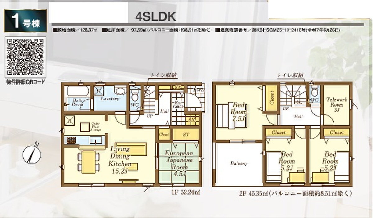 1号棟 間取り 4SLDK 価格 2190万円 建物面積 97.59m2 土地面積 128.37m2