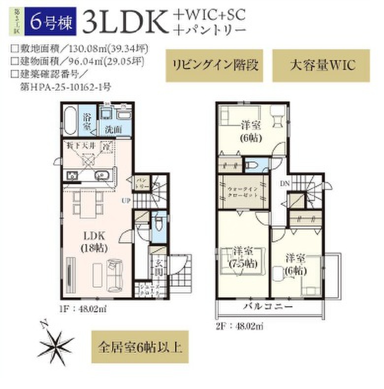 6号棟 間取り 3LDK+WIC+SC+パントリー 価格 2880万円 建物面積 96.04m2 土地面積 130.08m2 -