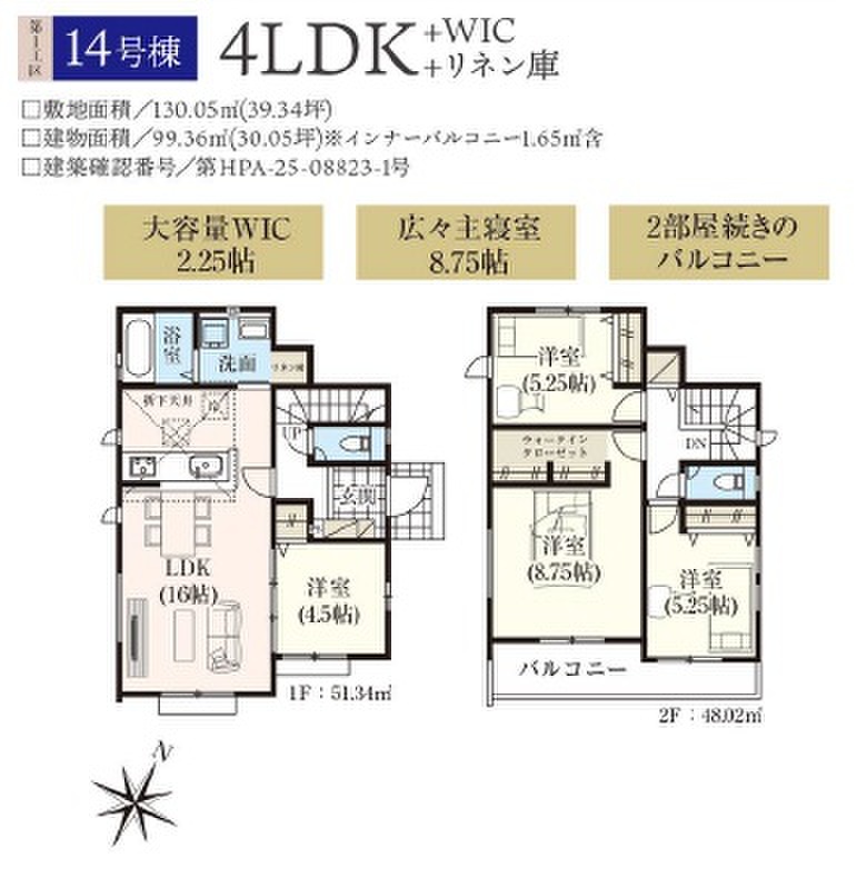 14号棟 間取り 4LDK+WIC+リネン庫 価格 2680万円 建物面積 99.36m2 土地面積 130.05m2 -