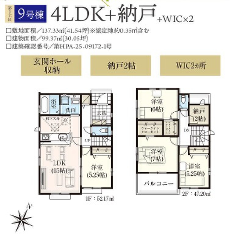 9号棟 間取り 4LDK+納戸+WIC×2 価格 2980万円 建物面積 99.37m2 土地面積 137.33m2 -