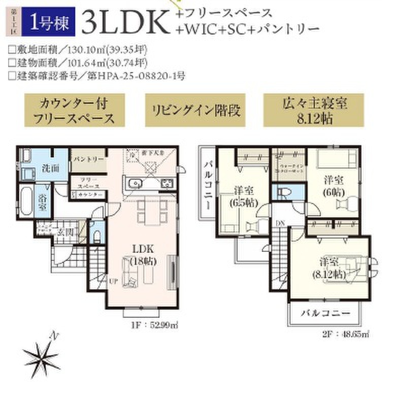 1号棟 間取り 3LDK+フリースペース+WIC+パントリー 価格 2980万円 建物面積 101.64m2 土地面積 130.10m2 -