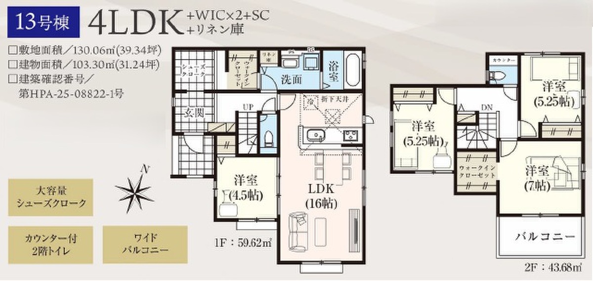 13号棟 間取り 4LDK+WIC×2+SC+リネン庫 価格 3280万円 建物面積 103.30m2 土地面積 130.06m2 -