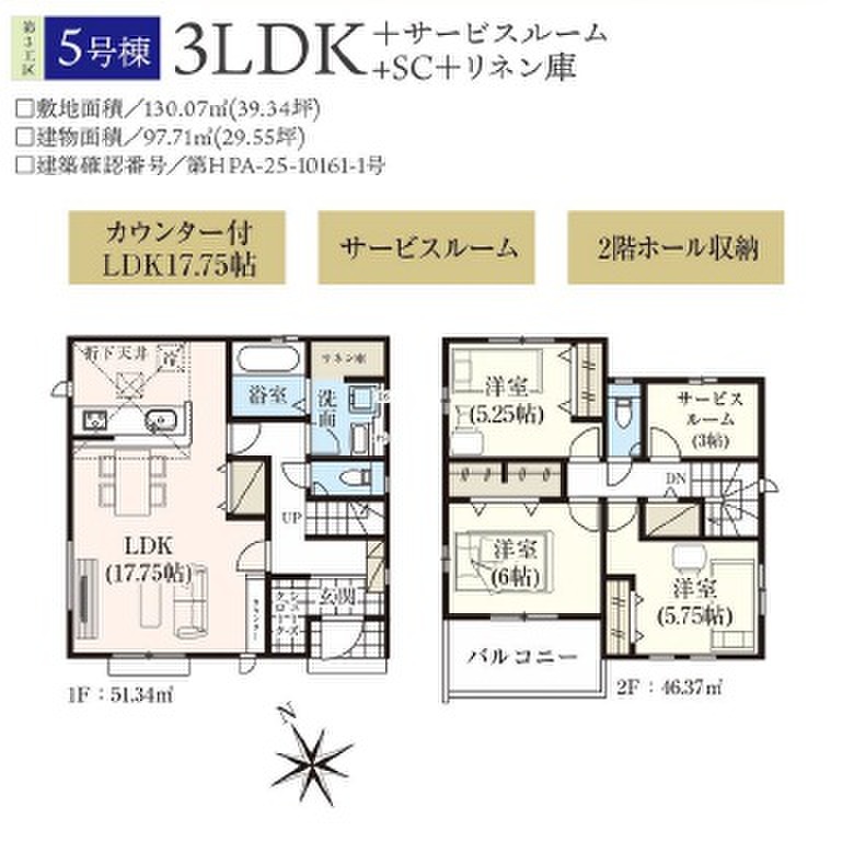 5号棟 間取り 3LDK+サービスルーム+SC+リネン庫 価格 3080万円 建物面積 97.71m2 土地面積 130.07m2 -