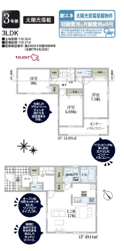 3号棟 間取り 3LDK 価格 4480万円 建物面積 100.17m2 土地面積 112.52m2 -