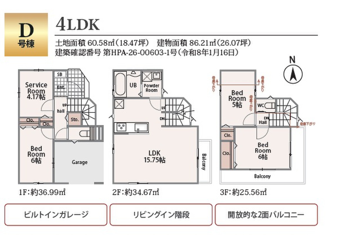 D号棟 間取り 4LDK 価格 5690万円 建物面積 86.21m2 土地面積 60.58m2