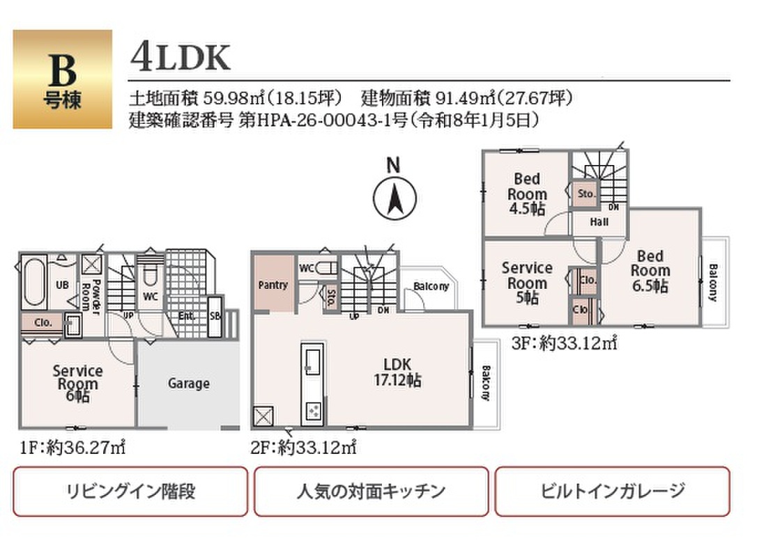B号棟 間取り 4LDK 価格 5490万円 建物面積 96.25m2 土地面積 60.35m2 -
