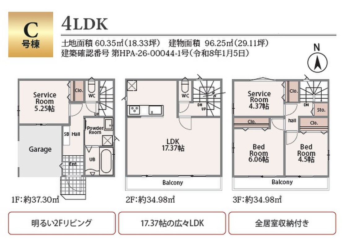C号棟 間取り 4LDK 価格 5490万円 建物面積 96.25m2 土地面積 60.35m2 -
