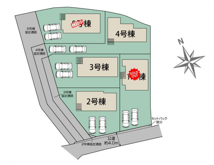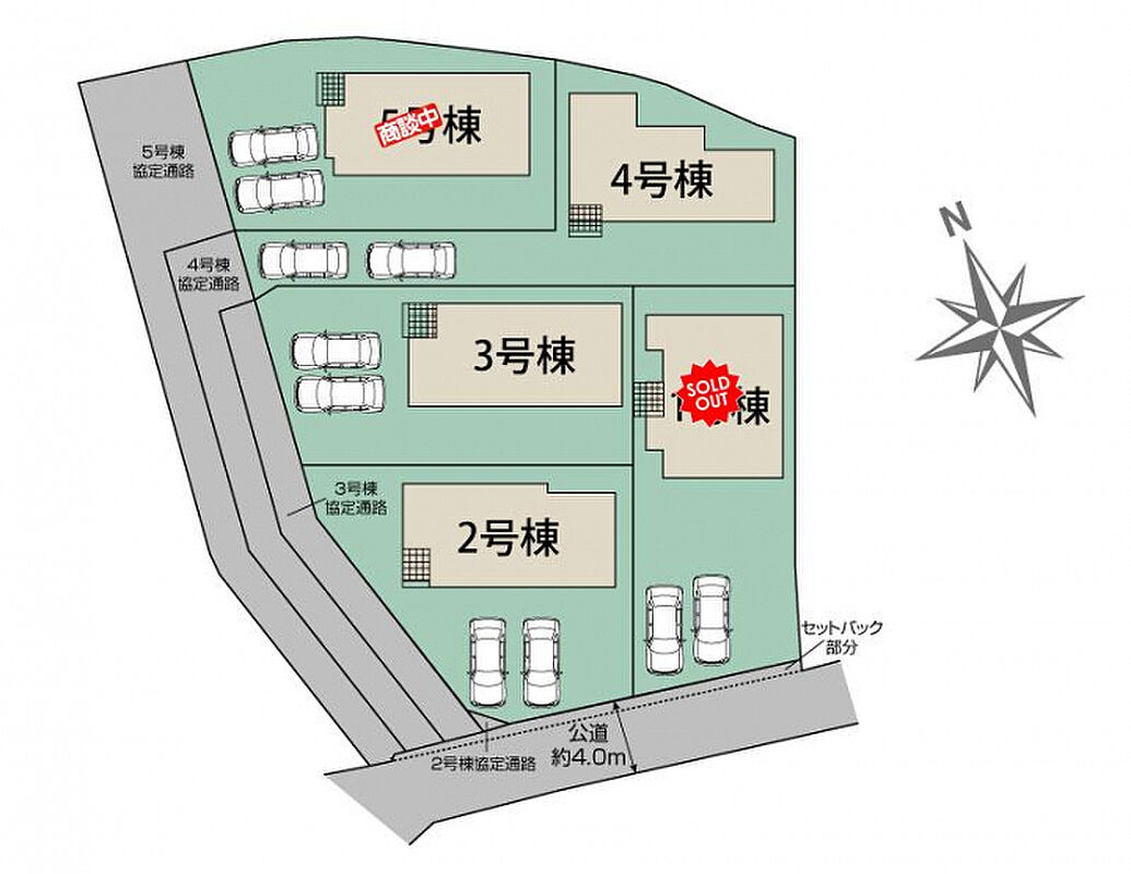 【接道】南4.0m公道(法42条2項道路) 【設備】公営水道、都市ガス、本下水、九州電力 【その他法令】法第22条区域、景観計画地域、居住誘導区域内、都市機能誘導区域外、宅地造成等工事規制区域 【その他記載事項】協定道路部分には地役権を設定致します(2・3・4・5号棟) 1・4号棟東側、5号棟北側に隣地工作物の越境あり 【その他持分】【セットバック持分】11.35m<sup>2</sup>×各1/5【未利用地持分】331.75m<sup>2</sup>×各1/5 |