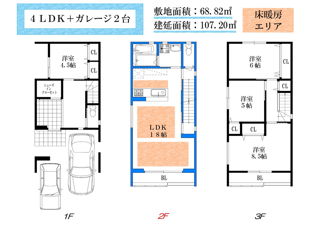 | 建物面積 | 104.22m2~123.12m2 | 土地面積 | 67.33m2~111.24m2 |