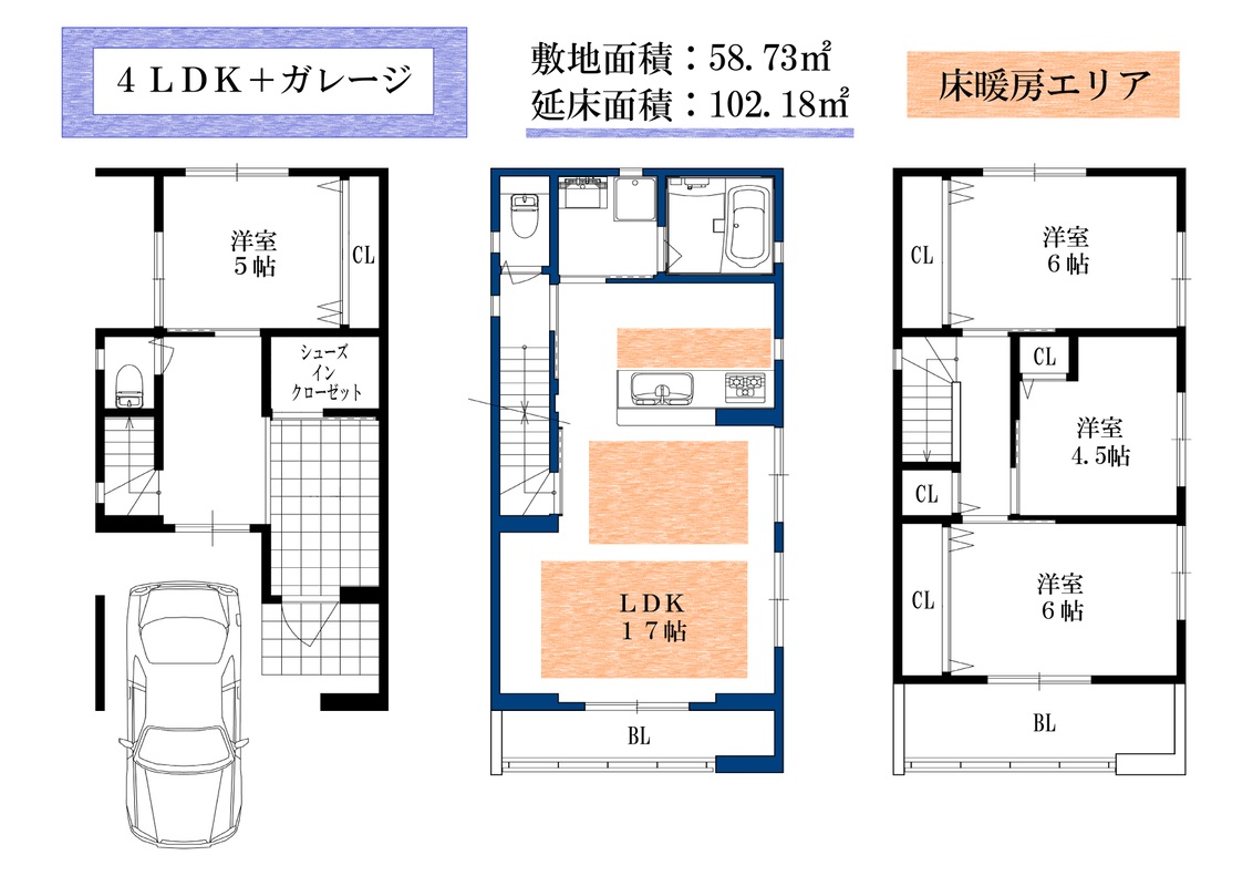 | 建物面積 | 102.18m2 | 土地面積 | 58.26m2~58.96m2 |
